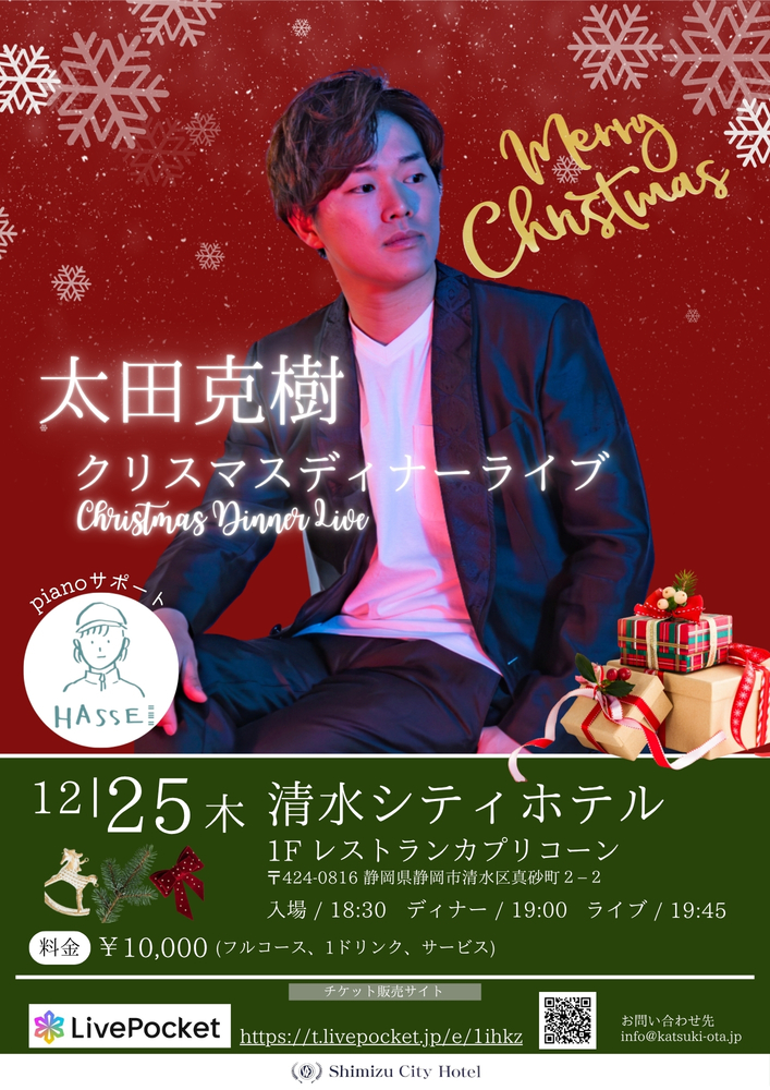 太田克樹クリスマスディナーライブ2025 SCHEDULE 2025/12/25(木) 18:30 - 清水シティホテル 1階カプリコーン 今年もパワーアップして!クリスマスに開催します! お料理、ライブ、企画!?全てワンランク上の内容をお届けします! 販売は11/19(水)20:00〜 ※お席には限りがあります。 https://livepocket.jp/e/gz4dj URLをコピーする 報告する