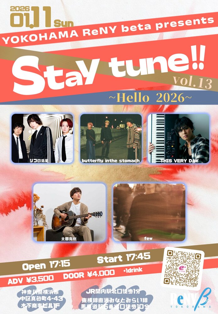 YOKOHAMA ReNY beta presents 「Stay tune!!」 SCHEDULE 2026/01/11(日) 17:15 - 横浜ReNYβ 地図を表示 チケットの購入はこちらから!yokohama URLをコピーする 報告する