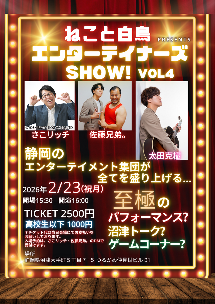 ねこと白鳥presents エンターテイナーズSHOW! VOL.4 SCHEDULE 2026/02/23(月) 15:30 - ねこと白鳥 地図を表示 入場ご予約は さこリッチさん、佐藤兄弟さんのDMで受け付けていただきます! さこリッチさんXアカウント https://x.com/maesakoyasunari?s=11 1/24(土)変更点あり 16:30 開場 → 1時間早まり 15:30開場 URLをコピーする 報告する
